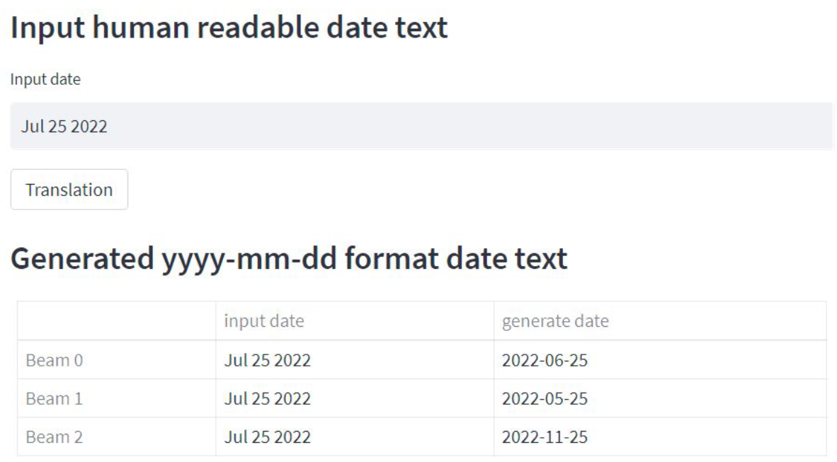 today = date.today().strftime('%b %d %Y') st.subheader('Input human readable date text') input_date = st.text_input('Input date', today) if st.button('Translation'): # 위 그림에 Translation 버튼이 눌리면 실행되는 코드 result = requests.get('http://127.0.0.1:8000/translation', params={'date': input_date}).json() data = [] index_data = [] for i, pred in enumerate(result['preds']): data.append([input_date, pred]) index_data.append(f"Beam {i}") df = pd.DataFrame(data, index=index_data, columns=['input date', 'generate date']) st.subheader('Generated yyyy-mm-dd format date text') st.table(df)