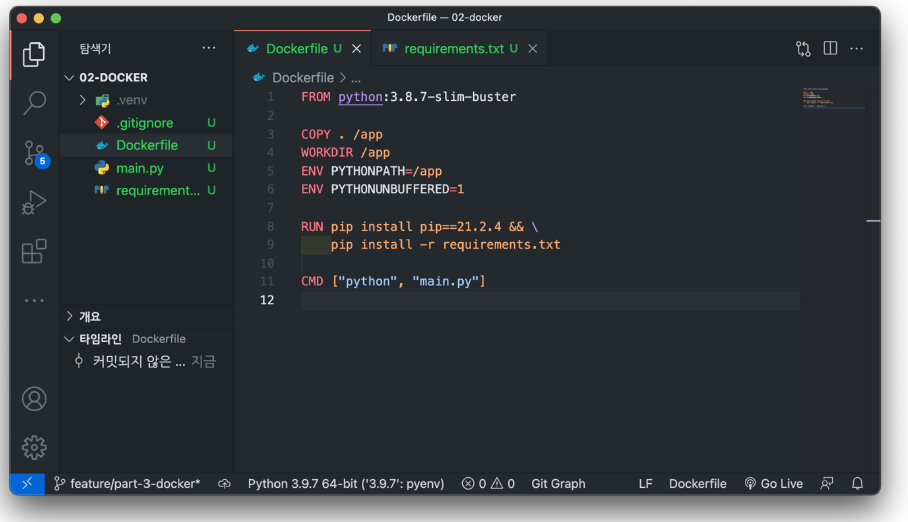 Dockerfile라는 파일을 만들어 다음처럼 작성(Docker Image를 빌드하기 위한 정보가 담김)