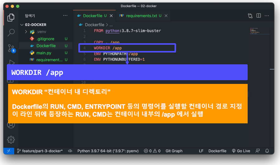 - WORKDIR로 RUN, CMD 등을 실행할 컨테이너 내 디렉터리 지정