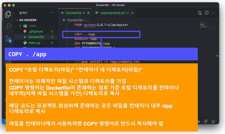 - COPY로 로컬 내 디렉터리 및 파일을 컨테이너 내부로 복사