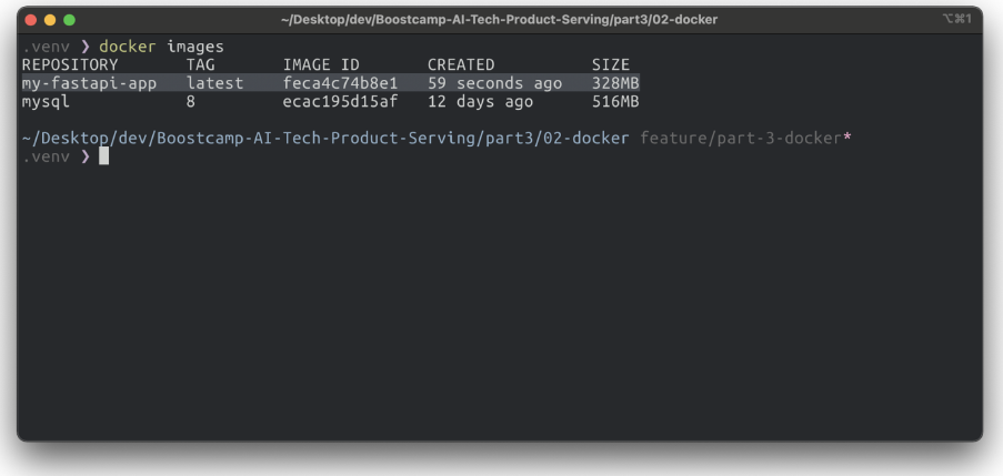 빌드를 마치면 docker images 명령어로 방금 빌드한 이미지를 확인할 수 있음
