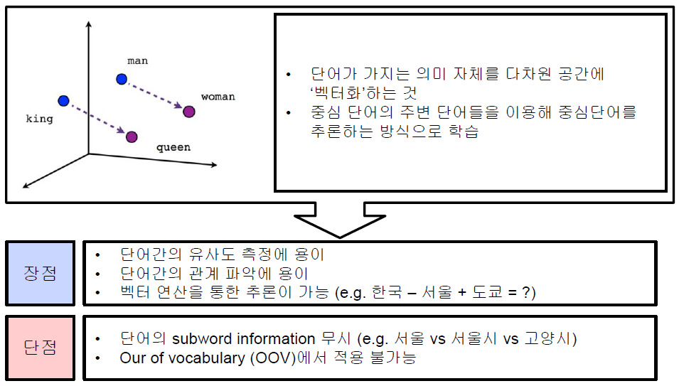 - 기존의 word2vec과 유사하나, 단어를 n-gram으로 나누어 학습을 수행