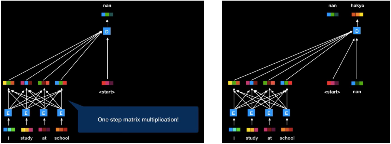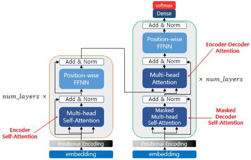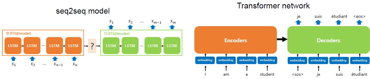 - 하지만 트랜스포머 네트워크는 인코더와 디코더를 따로 분리해두는 것이 아니라 하나의 네트워크 내에 인코더와 디코더를 합쳐서 구성하게 됨