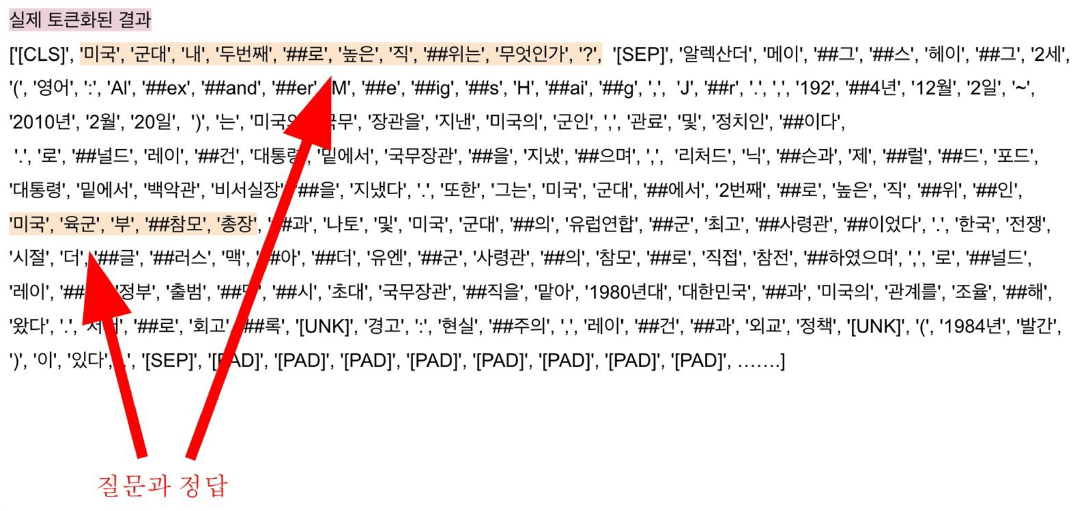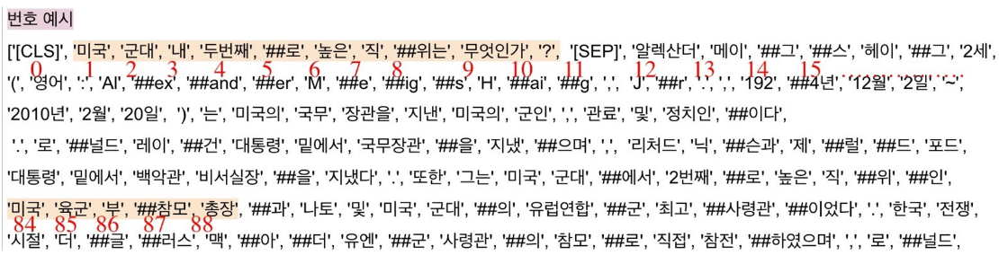- [’미국’, ‘군대’, ‘내’, ‘두번째’, ‘##로’, ‘높은’, ‘직’, ‘##위는’, ‘무엇인가’, ‘?’]