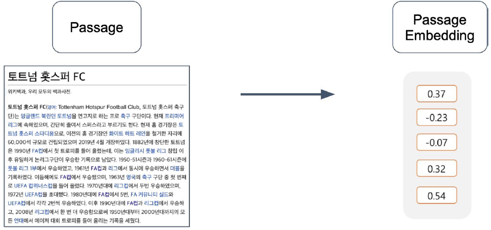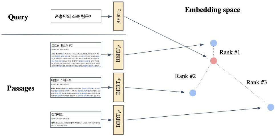 Inference : Passage와 query를 각각 embedding한 후, query로부터 가까운 순서대로 passage의 순위를 매김