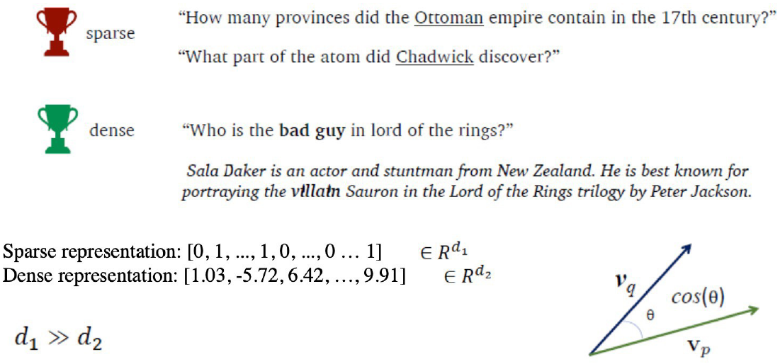 sparse는 항상 dense에 비해 차원이 크기 때문에 활용할 수 있는 알고리즘에 한계가 있지만 dense는 다양한 알고리즘을 활용할 수 있음