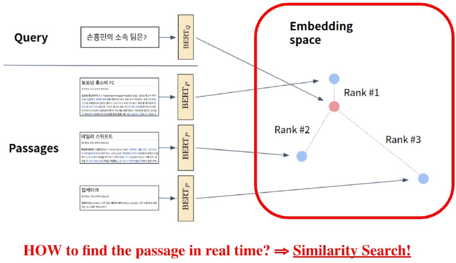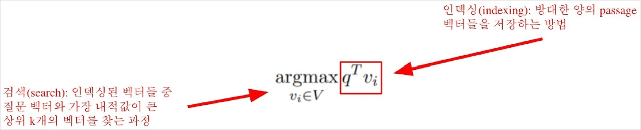 주어진 질문(query) 벡터 q에 대해 Passage 벡터 v들 중 가장 질문과 관련된 벡터를 찾아야함