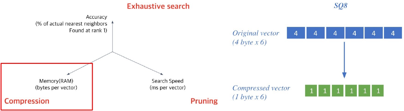 Compression : vector를 압축하여, 하나의 vector가 적은 용량을 차지 ⇒ 압축량↑ ⇒ 메모리↓, 정보 손실↑
