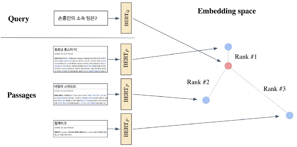 인퍼런스 : Passage와 query를 각각 임베딩한 후 query로부터 거리가 가까운 순서대로 passage에 순위를 매김