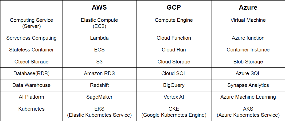 클라우드마다 제품의 이름은 다르지만, 비슷한 제품들이 있음