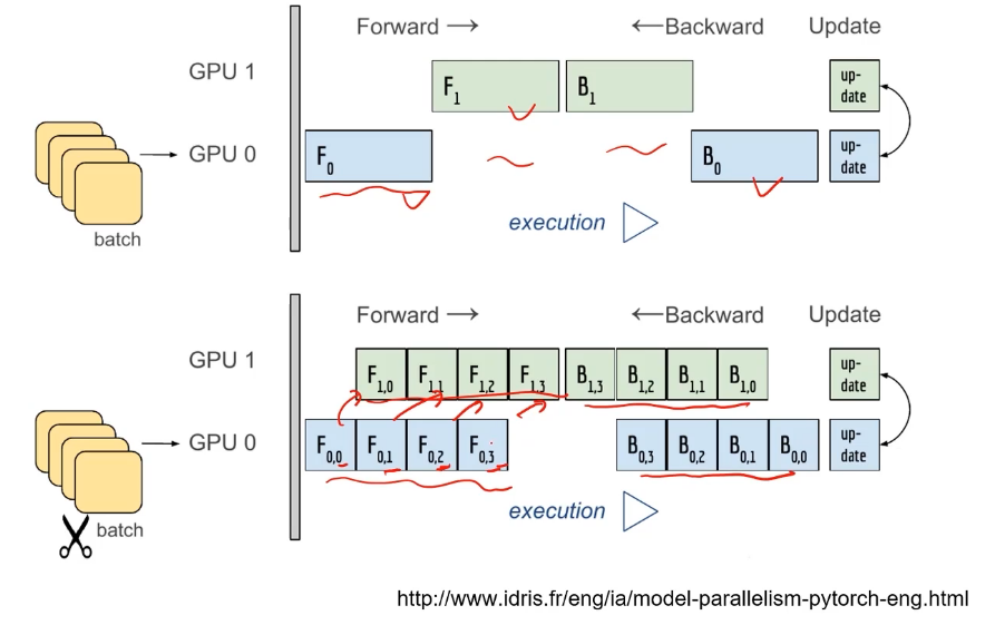class ModelParallelResNet50(ResNet): def __init__(sefl, *args, **kwargs): super(ModelParallelResNet, self).__init__( ~~ ) self.seq1 = nn.Sequential( ~~ ).to('cuda:0') # 첫번째 모델을 cuda 0(gpu 0)에 할당 self.seq2 = nn.Sequential( ~~ ).to('cuda:1') # 두번째 모델을 cuda 1(gpu 1)에 할당 self.fc.to('cuda:1') def forward(self, x): x = self.seq2(self.seq1).to('cuda:1') # 두 모델 seq1과 seq2를 cuda 1(gpu 1)에 연결하기 return self.fc(x.view(x.size(0), -1))