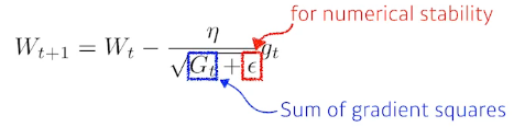 learning rate를 조절하여 자주 사용하지 않는 파라미터에는 큰 업데이트를 수행하고 자주 사용하는 파라미터에는 작은 업데이트를 수행함