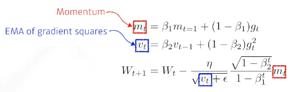 gradient 또는 gradient squared 크기가 변함에 따라서 adaptive하게 learning rate를 바꾸는 것과 이전의 gradient 정보에 해당하는 momentum을 잘 합친 방법