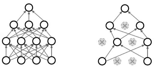 - 각 forward pass 과정에서 무작위로 몇개의 뉴런들을 zero로 만듬 (연산에 포함되지 않도록)