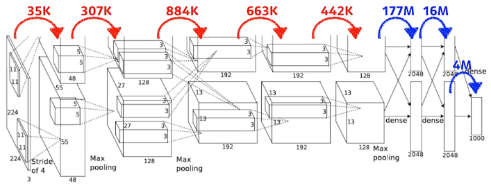 - 빨간색 : convolution layer, 파란색 : dense layer