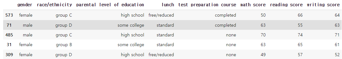 - 수학, 읽기, 쓰기 성적 (0~100)