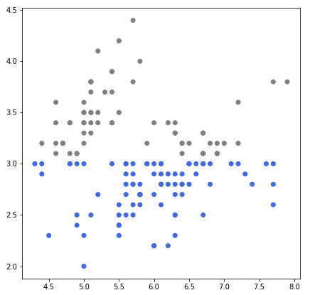 c=['royalblue' if yy <= swc_mean else 'gray' for yy in iris['SepalWidthCm']]