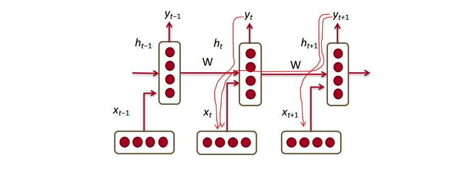 - 매 time step마다 RNN 모듈을 정의하는 파라미터 W는 모든 time step에서 동일한 값을 공유함