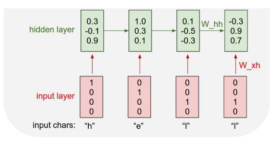 http://karpathy.github.io/2015/05/21/rnn-effectiveness/ $h_t=tanh(W_{hh}h_{t-1}+W_{xh}x_t+b)$