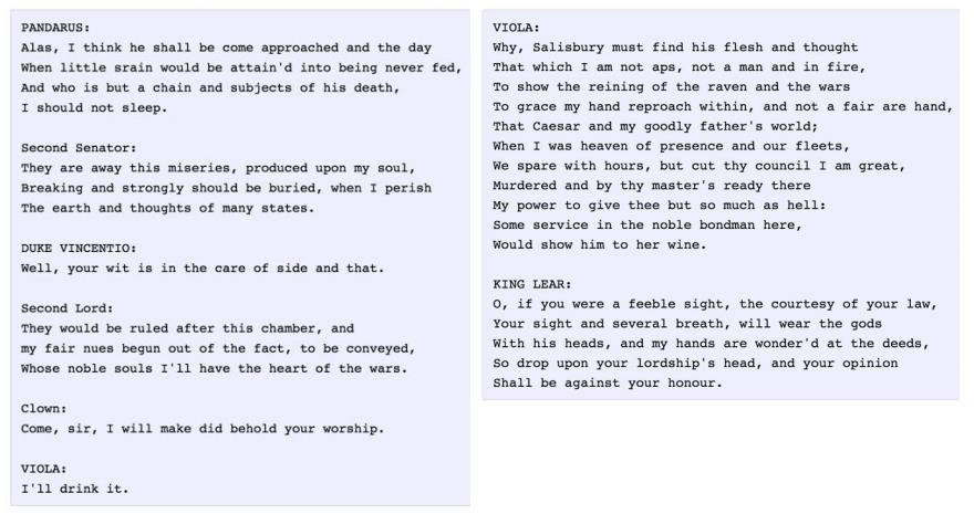 http://karpathy.github.io/2015/05/21/rnn-effectiveness/ - 주어진 학습 데이터의 패턴(”:” 다음에 줄바꿈 후 대사가 나옴)을 효과적으로 학습함
