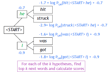 - $score(y_1, ..., y_t)=logP_{LM}(y_1,...,y_t|x)=\sum^t_{i=1}P_{LM}(y_i|y_1, ..., y_{i-1},x)$