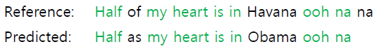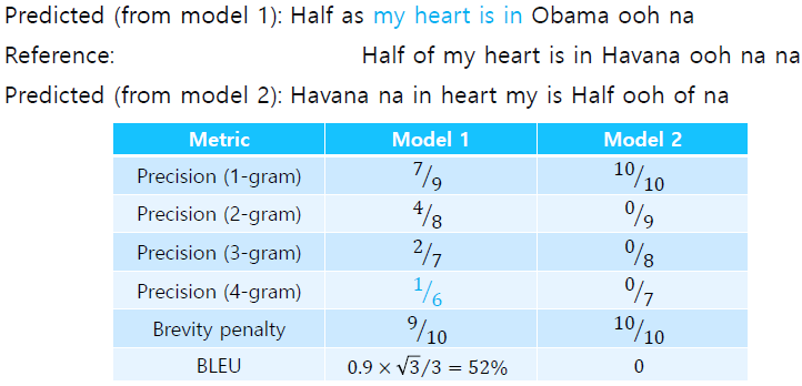 - $BLEU = min(1, \frac{length\ of\ prediction}{length\ of\ reference})(\prod^4_{i=1} precision_i)^{\frac{1}{4}}$