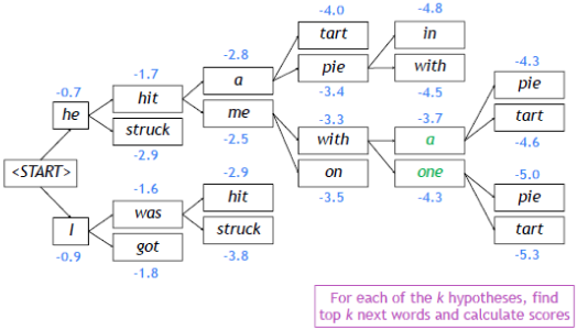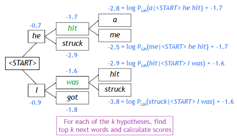 - We search for high-scoring hypotheses, tracking the top $k$ ones on each step