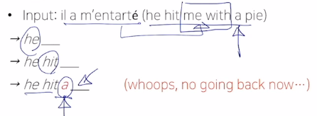 - Greedy decoding에서는 hit 다음에 me가 나와야 하는데 뒤늦게 단어를 a로 잘못 생성했다고 알게되어도 되돌아갈 수 없음
