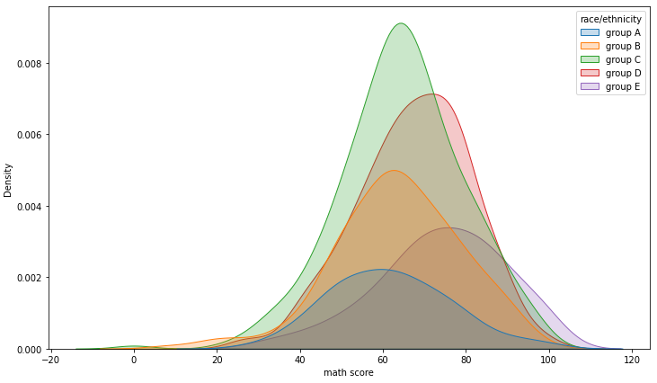 sns.kdeplot(x='math score', data=student, ax=ax,