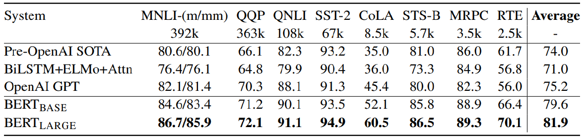 BERT : GLUE Benchmark Results