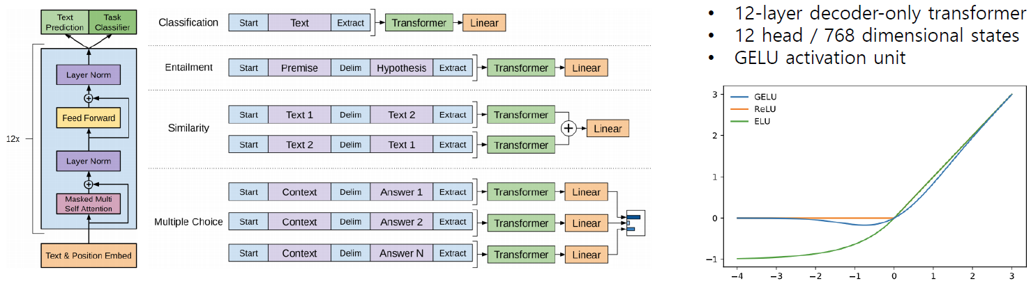 - <S>, <E>, $ 등과 같은 다양한 스페셜 토큰을 제안하여 간단한 task뿐만 아니라 다양한 자연어처리에서의 많은 task들을 동시에 커버할 수 있는 통합된 모델을 제안했다는 것이 주요한 특징