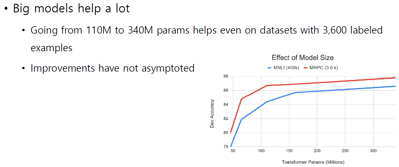 - 레이어를 점점 더 깊게 쌓고 레이어별 파라미터를 점점 더 늘리는 방식으로 모델을 학습하면(모델 사이즈를 점점 더 키울수록) 여러 down-stream task에 대한 성능들이 끊임없이 좋아짐