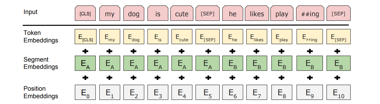 - 그래서 segment embedding을 통해 첫 번째 문장은 첫 번째 문장이라는 것을 나타낼 수 있는 embedding 값을 더해주고 두 번째 문장은 두 번째 문장이라는 것을 나타낼 수 있는 embedding 값을 더해줘서 각각의 문장이 이어졌다는 것을 나타내줌