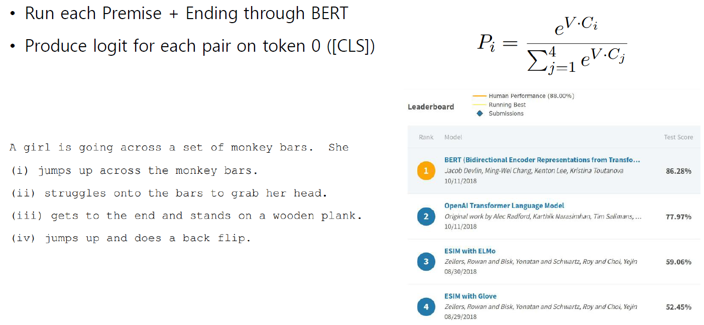 - 위 예시에서는 가능한 경우의 수가 4가지 이기 때문에 비효율적일 수 있지만 첫 문장과 가능한 4개의 선택지들을 각각 concat하여 BERT를 통해 인코딩하고 나온 [CLS] 토큰에 임베딩 벡터가 2차원이면 출력 FC 레이어를 거쳐서 스칼라 값을 예측하도록 함