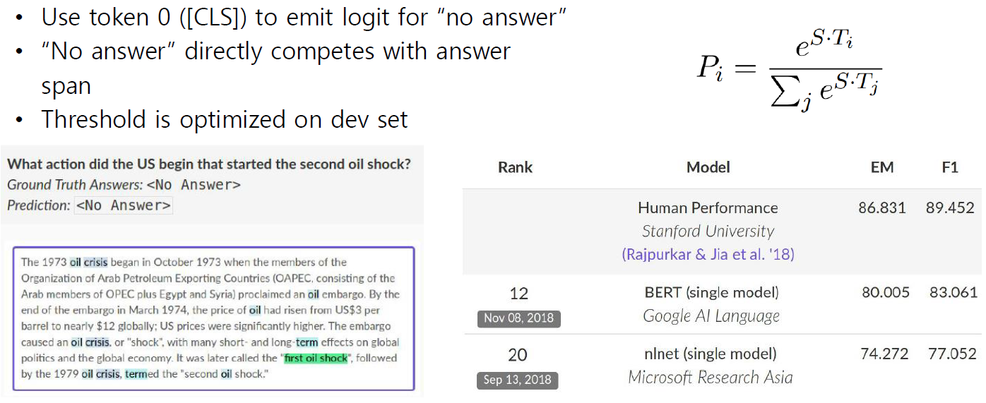 - 그 경우에 [CLS] 토큰을 활용할 수 있고 지문과 질문을 concat하여 하나의 sequence로 만들고 BERT를 통해 인코딩하여 나온 [CLS] 토큰에서 주어진 질문과 지문에 대한 쌍에서 답이 실제로 없는(ground truth가 no answer라고 표시된) 경우는 [CLS] 토큰을 binary classification하는 출력 레이어를 두고 cross-entropy loss를 통해 결과값이 no answer로 적절히 예측되도록 학습하게 됨