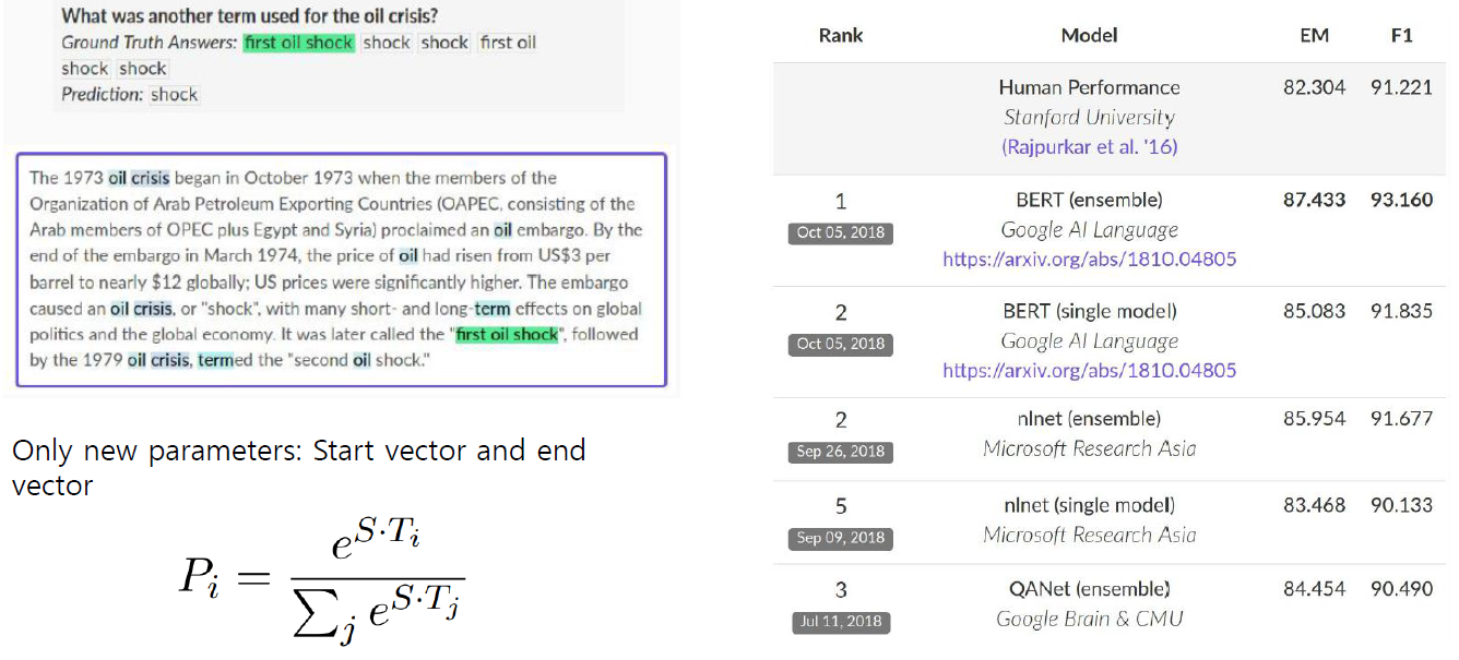 - 답에 해당하는 문구가 시작하는 위치를 예측하기 위해 각 단어별로 최종 인코딩 벡터가 출력으로 나왔을 때 이를 공통된 출력 레이어를 통해(스칼라 값을 뽑도록 하는 출력 레이어를 통해) 결과값을 얻게 됨