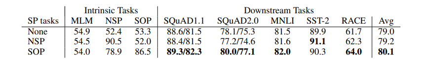 ALBERT: A Lite BERT for Self supervised Learning of Language Representations, ICLR’20 pertraining에 SOP를 적용한 결과가 더 좋음