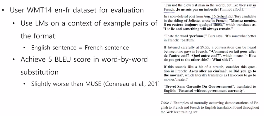 - 자연어처리의 모든 task는 QA task로 바뀔 수 있다는 사실에 입각하여 주어지는 대화형 QA 데이터가 있을 때 대화를 주고 바로 다음에 나올 답을 예측하도록 했을 때(즉, 학습 데이터를 하나도 쓰지 않고 task에 대한 예측을 수행했을 때, zero-shot setting) fine-tuning한 후 달성한 성능에는 못 미치지만 어느 정도는 충분히 가능성을 보임