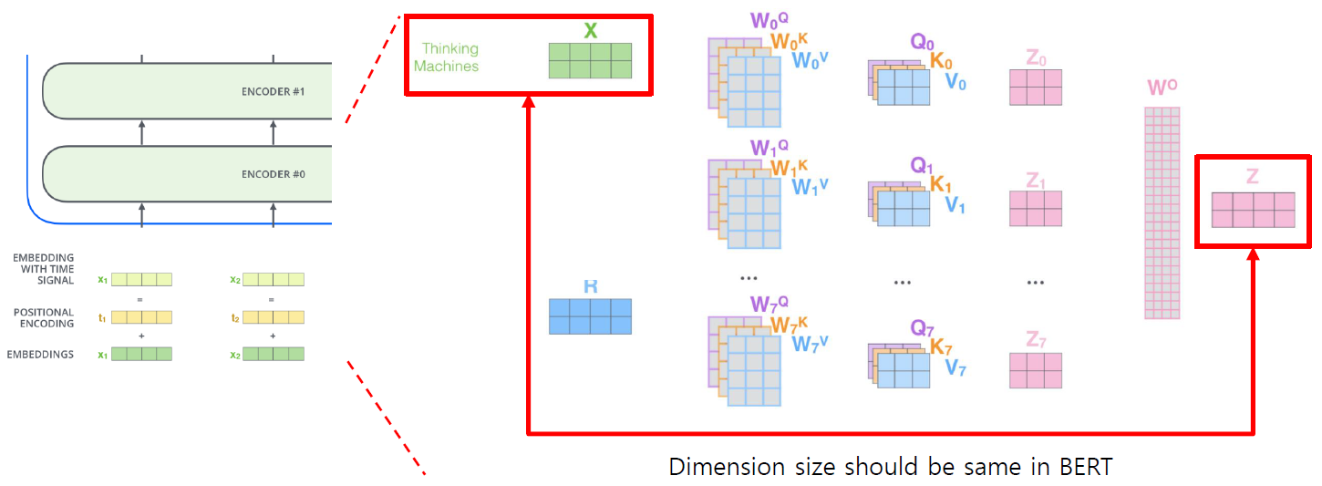 http://jalammar.github.io/illustrated transformer/ BERT에서는 임베딩 레이어와 self-attention block에서 사용되는 차원과 동일해야 함