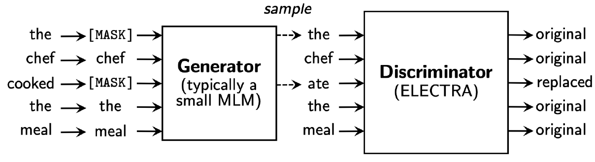 ELECTRA: Pre training Text Encoders as Discriminators Rather Than Generators, ICLR’20 mask된 단어를 복원해주는 모델(generator)를 두고 generator가 복원한 단어에 대해서 예측된 단어인지 원래부터 있었던 단어였는지 예측하는 모델(discriminator)을 두는 형태가 ELECTRA 모델의 핵심적인 특징