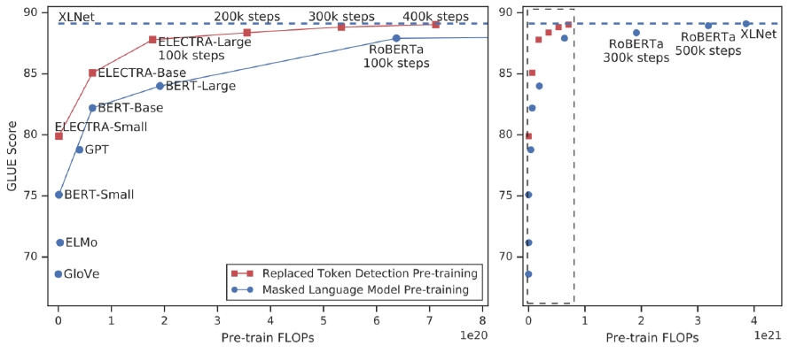 ELECTRA: Pre training Text Encoders as Discriminators Rather Than Generators, ICLR’20 ELECTRA 모델이 BERT 모델에 비해서 학습에 필요한 계산량이 같은 경우에 더 좋은 성능을 보여줌